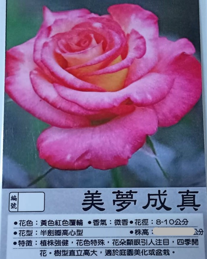 花色:黃色紅色覆輪,花香:微香,花徑:8-10公分。